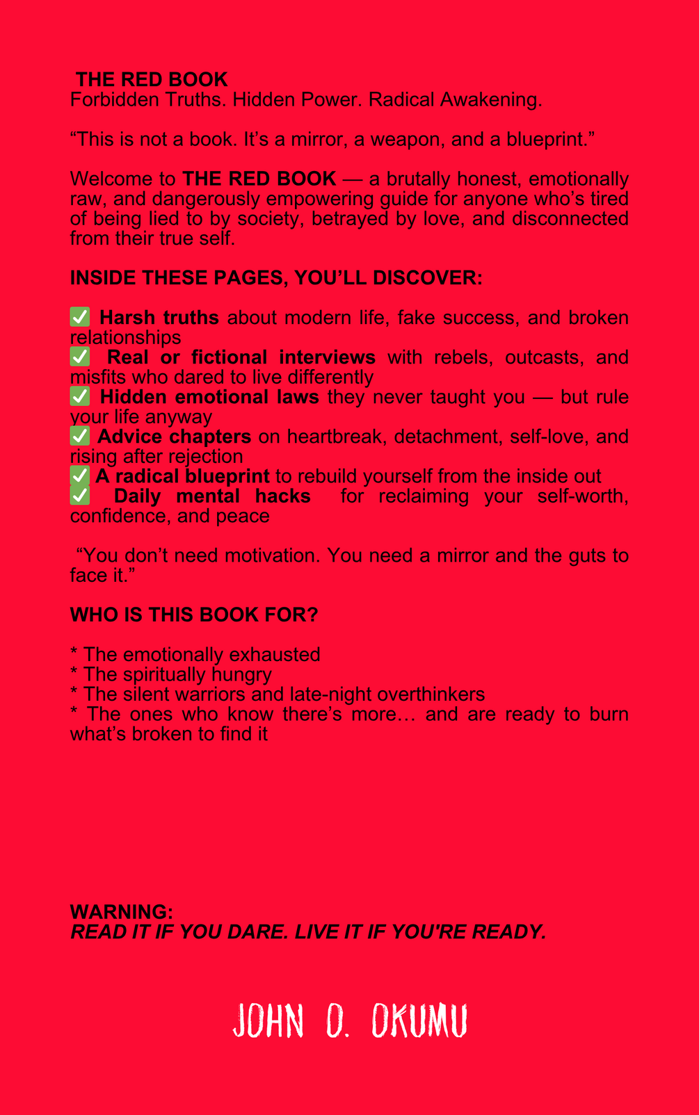 Welcome to THE RED BOOK— a brutally honest, emotionally raw, and dangerously empowering guide for anyone who’s tired of being lied to by society, betrayed by love, and disconnected from their true self.